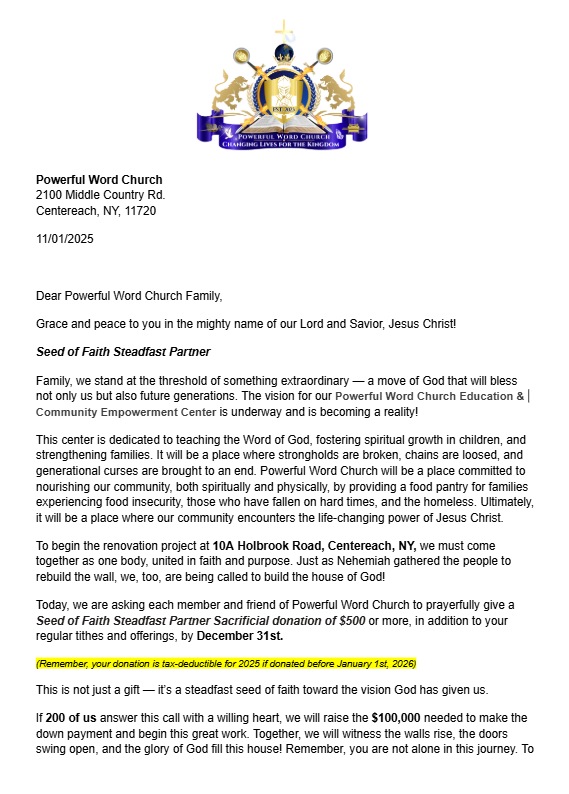 At Powerful Word Church, we're building the Lord a house of Worship & a place of refuge for our Community
